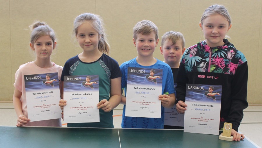 Bei den Frauen konnte sich Rita Goldschmidt vom TTV Mixdorf (Brandenburg) durchsetzen. Da hat sich ja die weite Anreise gelohnt. Zweite wurde Kerstin Ossenkopp aus Chemnitz vor Bärbel Kaminski aus Frankenberg. Bei den Männern waren viele heiß umkämpfte Duelle dabei. Letztlich siegte der Favorit Bernd Theuner aus Machern klar mit 3:1 im Finale gegen Andreas Goldschmidt vom TTV Mixdorf. Dritter wurde ein sehr starker Jan Schilk aus Chemnitz. Den Kinderwettbewerb bestritt der Nachwuchs der SG Sitten unter sich. Alle wollten zeigen, was sie im Training bei Dieter Sonnenschein gelernt hatten. Letztlich war Leo Möbius vor seinem Bruder Levi Möbius siegreich. Dritte wurde Linnea Lange.